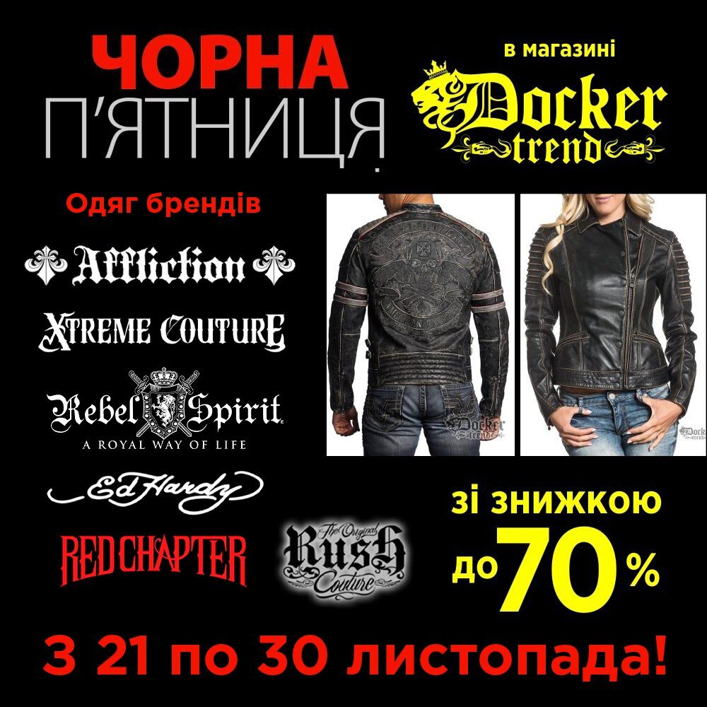 Поспішай! З 23 по 25 листопада — Чорна п’ятниця в магазині Docker Trend найкрутіші знижки до 70% на Affliction, Red Chapter, Rebel Spirit, Eleven, Mek Denim и Rush Couture.
